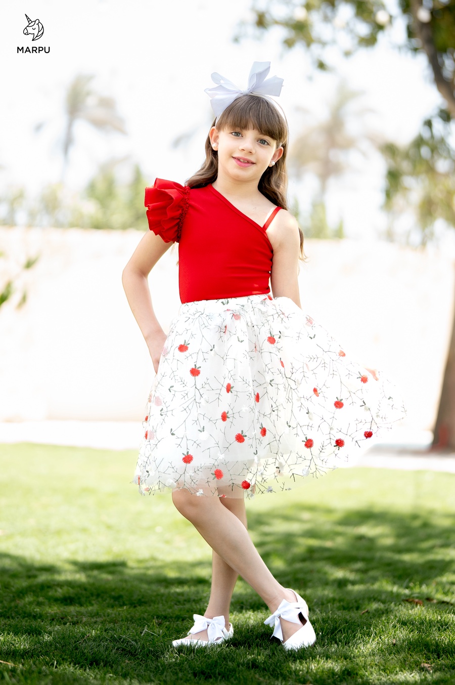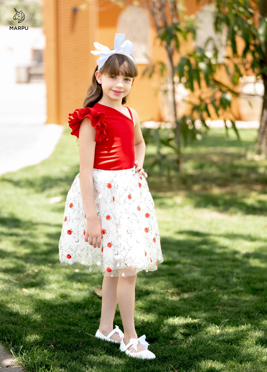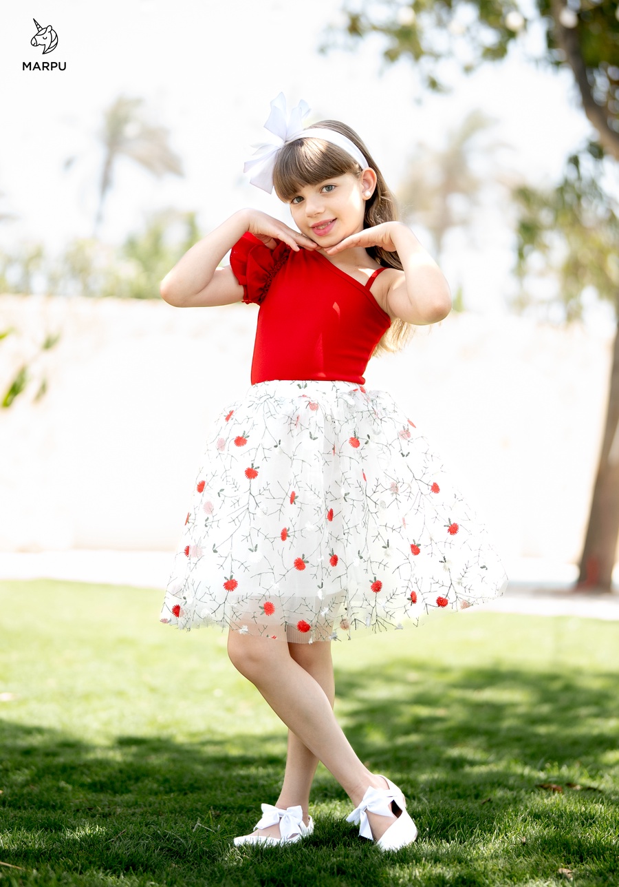 وجيبة تل ورد أحمر مطرزة بطبقات تل ناعمة وبطانة روزيتة بتدي شكل سواريه فاخر